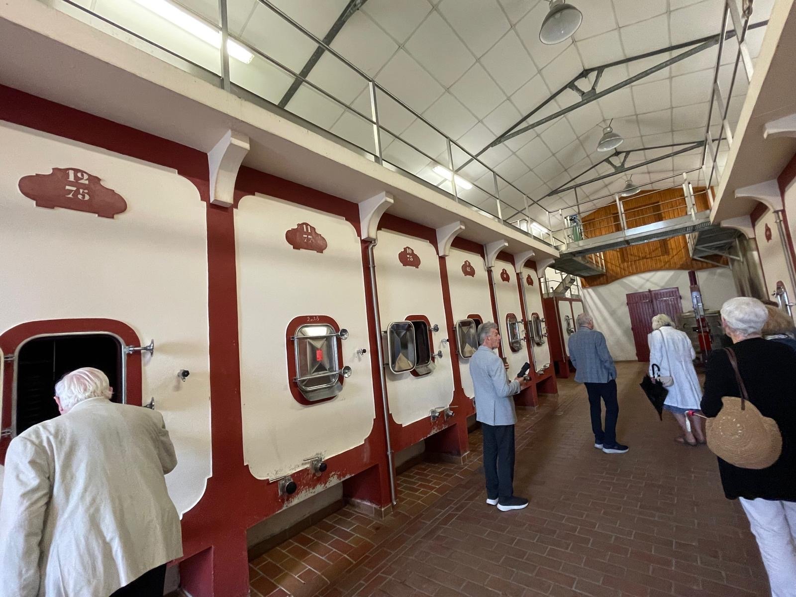 After this she took us to the barrel room where we tasted the property’s second wine, Baies de Bernateau 2020 before being joined by her husband, the winemaker, Pierrick for lunch which was served on circular tables down the area between the stainless-steel vats in the chais. The first course of Foie Gras with a gelée of Lillet and some figs was matched with two wines from the family’s other château – Châteaux Peyronneau Merlot 2020 and Peyronneau Cabernet Franc 2020. The main course, a delicious piece of Filet de Boeuf with truffled Gratin Dauphinoise, came with Châteaux Bernateau 2018 and 2019 which were much enjoyed. In case we should still be hungry, a cheeseboard arrived on which there were 7 cheeses to choose from and another vintage Bernateau served blind from decanters from which we were asked to identify the vintage. It was in perfect condition both in colour, nose and taste. There were lots of unsuccessful guesses made before Pierrick broke the news that it was from the first vintage after he took over from his father, namely in 2002. A lovely wine from a, generally, unremarkable vintage. The splendid lunch was rounded of with new season’s fresh strawberries with ice cream, whipped cream and a red fruits coulis. Needless to say several of us made purchases in the shop before we left.