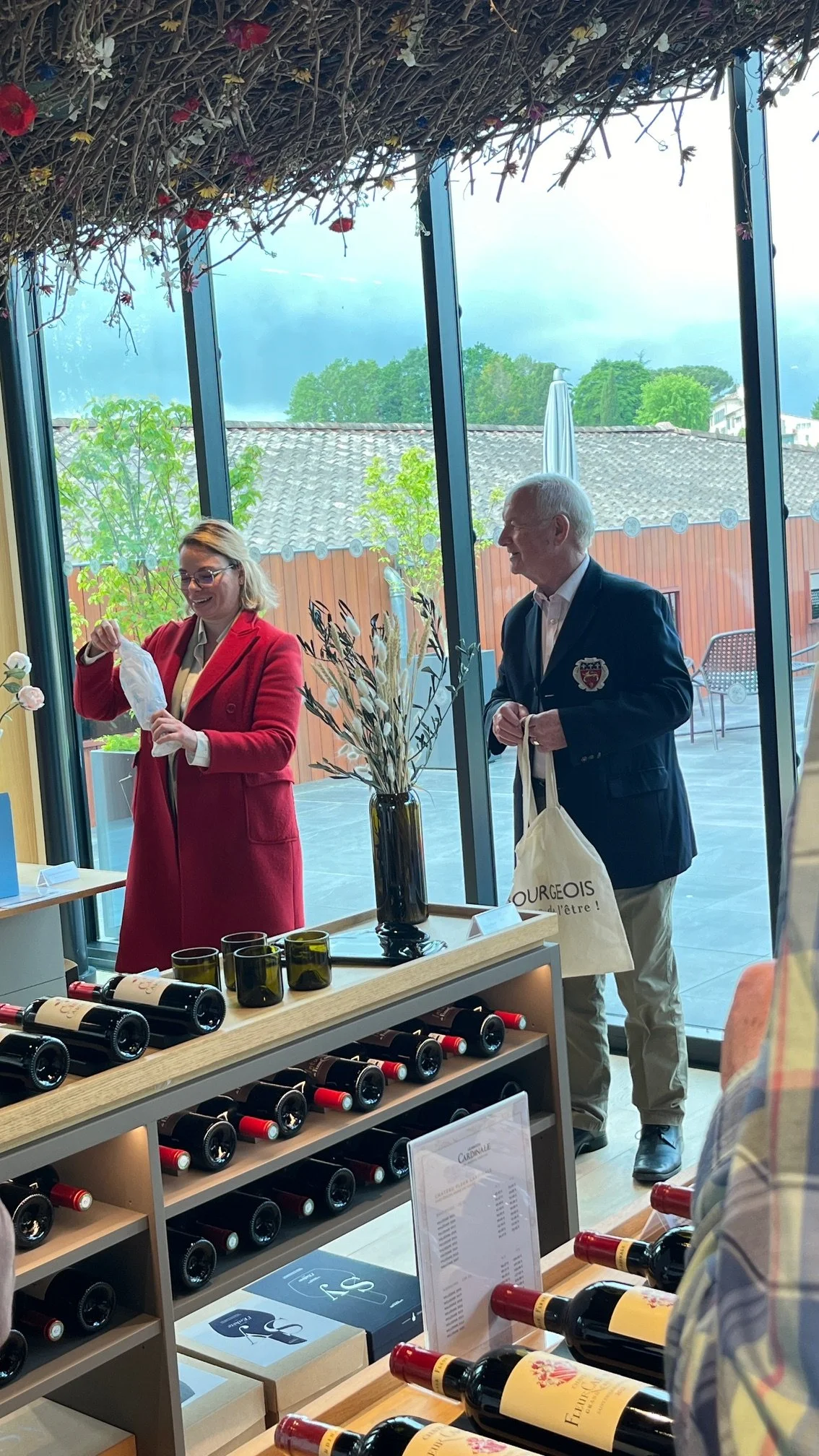 Next we progressed upstairs (rejoining the rest of the party) to the panoramic tasting room for a tasting of the wines which were Ch. Croix Cardinale 2018 (75% Merlot & 25% Cabernet Franc) finishing with grand vin Ch Fleur Cardinale 2018 (74% Merlot 22% Cabernet Franc 4% Cabernet Sauvignon) both of which were enjoyed. During the tasting, we were joined by Caroline, the daughter-in-law of the family and, before we left, the father, Dominique Decoster, came to say “hello”.