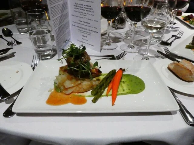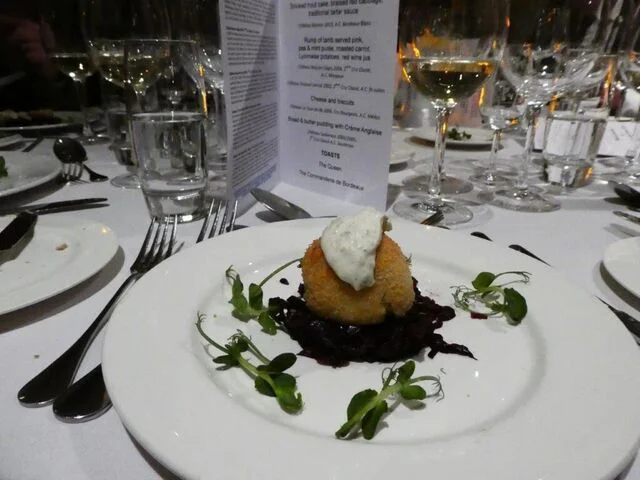 The starter was Smoked trout cake, braised red cabbage, traditional tartare sauce which was well matched with Château Reynon 2013, A.C. Bordeaux Blanc. The wine competed with a number of flavours in this dish but due to its fullness, keen acidity and bouquet of citrus fruit held its own.
