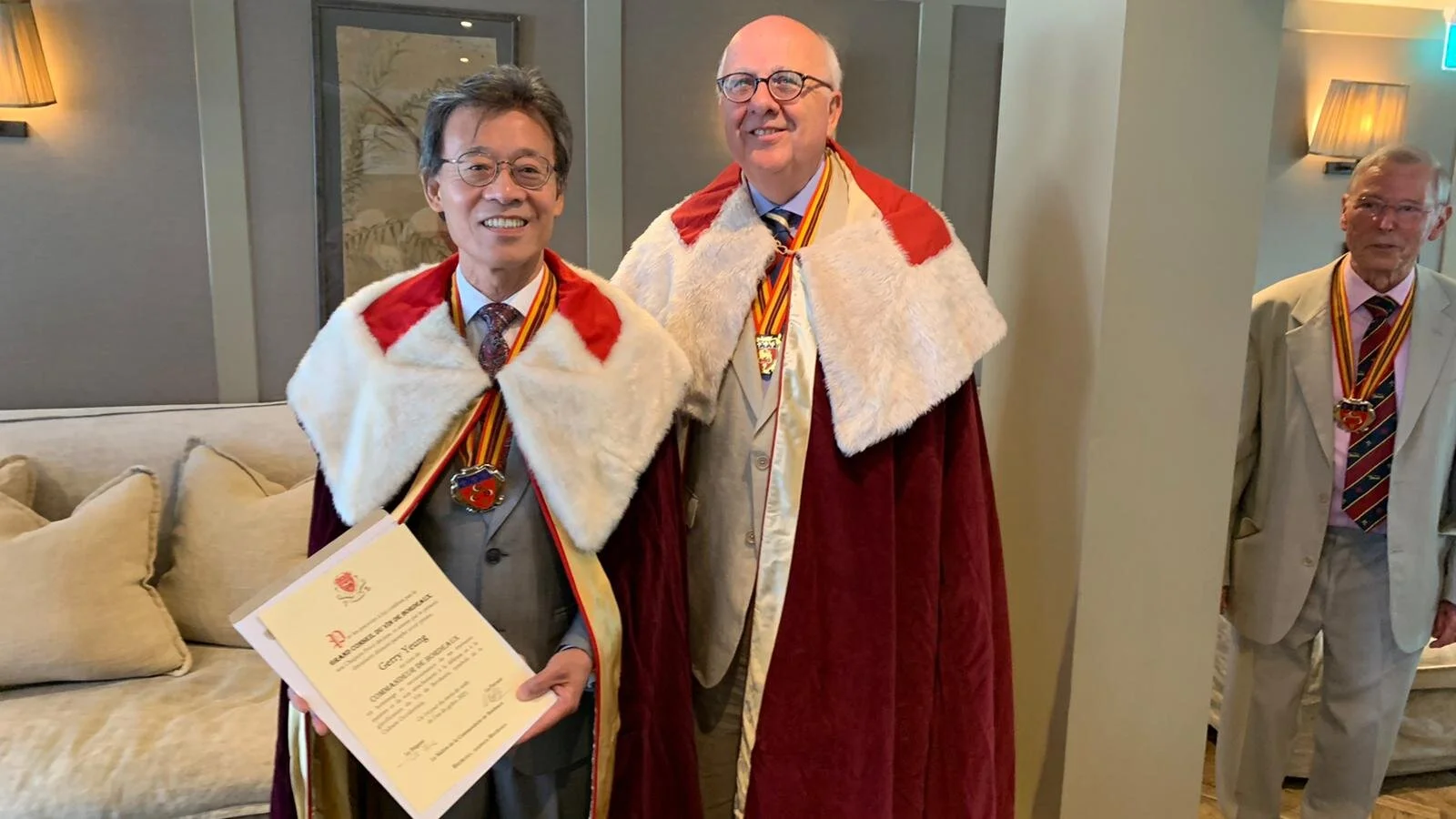 As members and their guests took a glass of Champagne into the dining area our newest member, Gerry Yeung, was preparing to be ‘intronised’. The simple ceremony whereby the Maitre, Peter Russell, presented Gerry with his ‘gong’ and certificate of membership and Gerry swore his allegiance to the wines of Bordeaux was a pleasant introduction to the afternoon’s procedures.