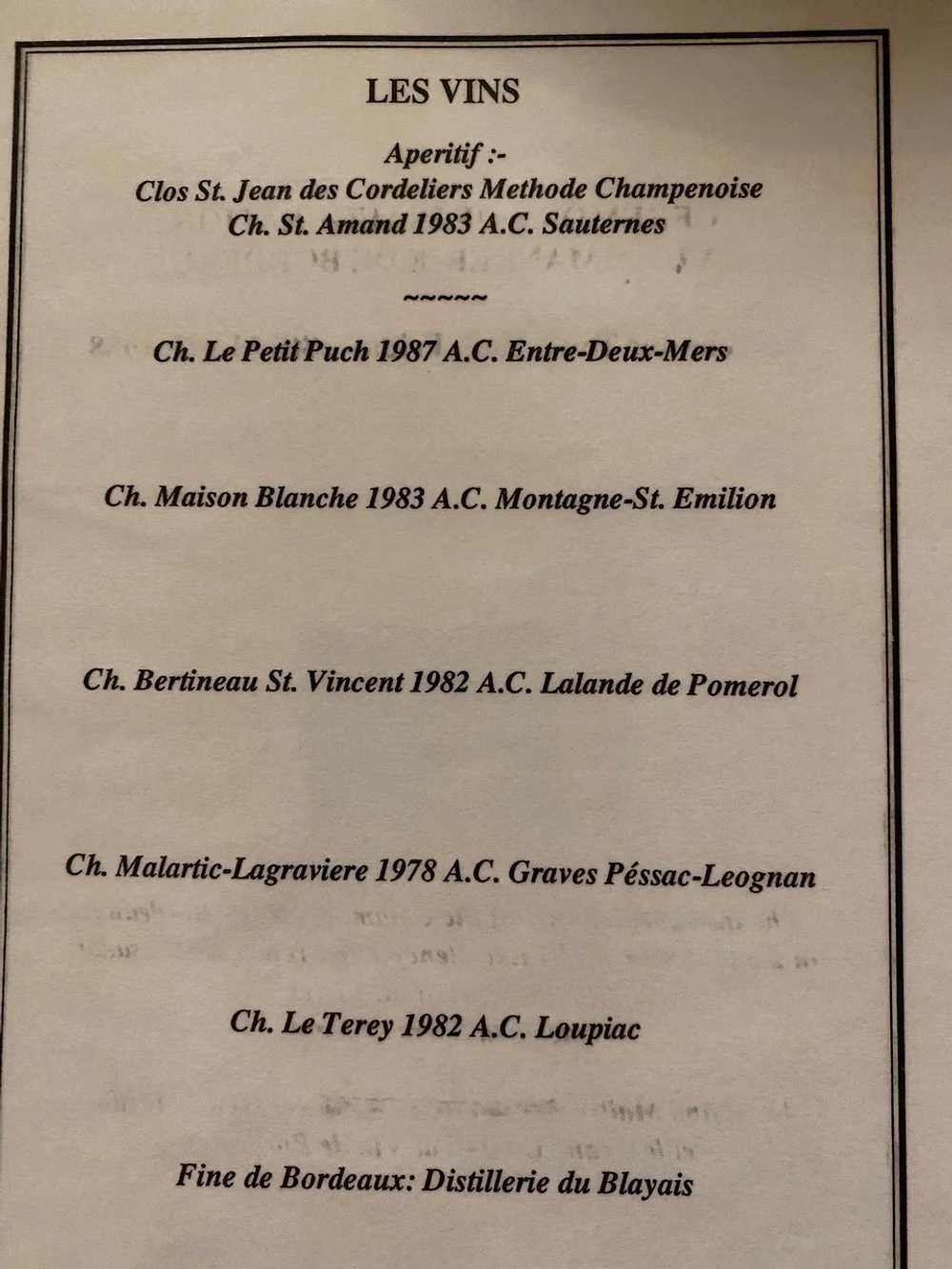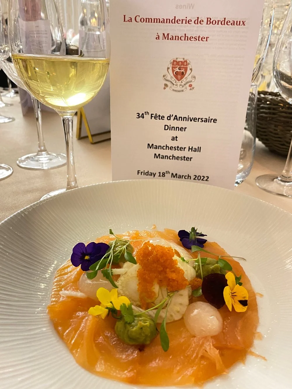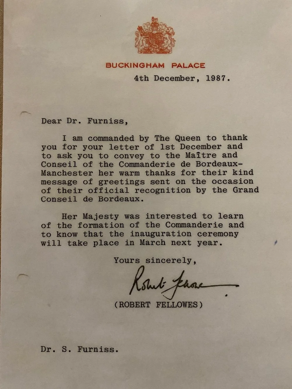 34 years ago, to the day, the inaugural dinner for the Commanderie de Bordeaux à Manchester was held at Manchester Town Hall. I suspect that the founding Commanders would have been delighted to witness the excellent turnout for the 34th anniversary at the Manchester Hall, our latest dining venue. For the occasion, Maître had been digging in the Commanderie archives and found the minutes and menu from that first meeting. Also discovered was very polite “thank you, but busy” from Her Majesty the Queen, who was invited to attend.
