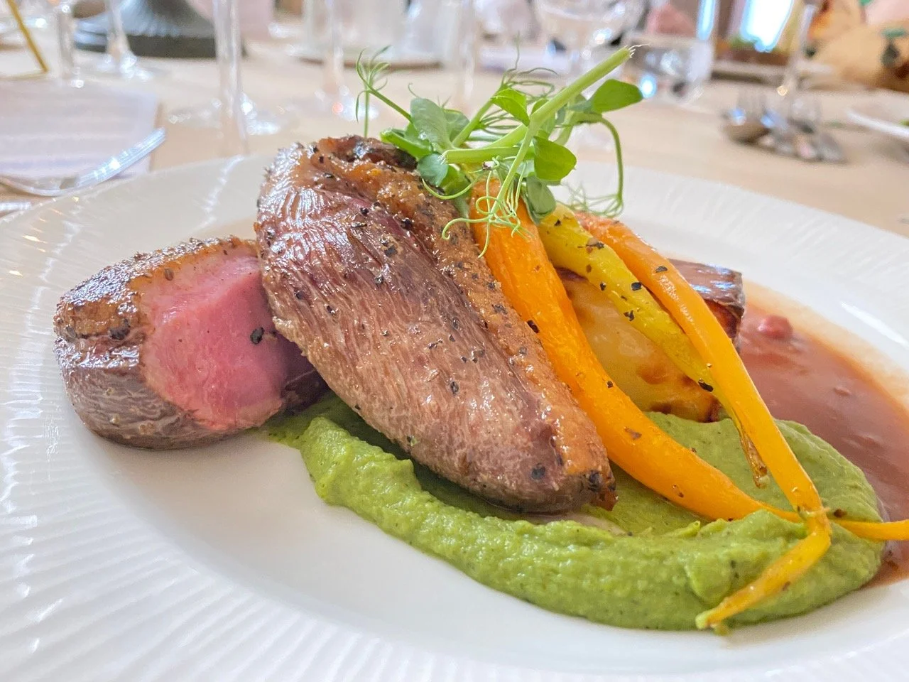 The first course was oak smoked salmon, fennel, avocado cream, tobiko, coriander and pea shoots and was served with a Château Argadens Blanc, 2017 A.O.C Bordeuax from the Entre-deux-mers region. This wine is a blend of predominantly sauvignon blanc, with approximately one third semillon giving it a buttery-smooth texture and an oakiness that perfectly suited the first course. Delicious!