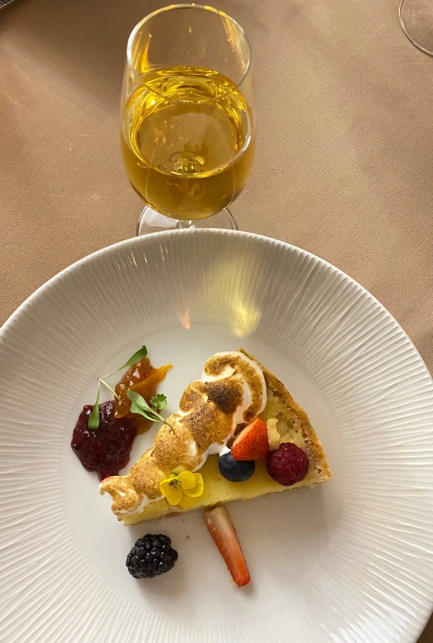 The dessert course was a lemon tart, with meringue, berry fruits, kumquat jam and raspberry jam. Served with a Château Clos Haut-Peyraguey 2014 1er Cru A.O.C Sauternes; a blend of 90% Semillon and 10% Sauvignon Blanc. This wine gave apricot and orange flavours which complimented the dessert but was felt to lack a little “oomph”.