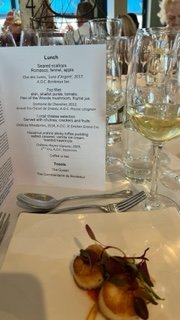 The meal commenced with Seared Scallops Romasco with fennel and apple accompanied by Clos des Lunes, ‘Lune d’Argent’ 2017 A.O.C. Bordeaux Sec. The remarks on this wine were favourable although some would have preferred it to have more fruit.