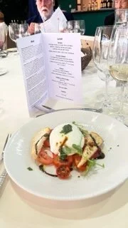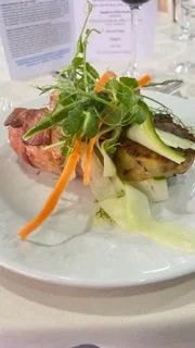 The lunch itself started with a spectacular and very summery dish of burrata with heritage and dried cherry tomato and gremolata. The quality was very high even if the quantity proved a bit too much for some. The challenge, of course, was finding a wine which worked with the dish as tomato and wine are a notoriously difficult partnership. However, it was generally agreed that the Chateau Marjosse 2021 worked well, especially with the burrata, and was a most enjoyable wine to drink with and without food.