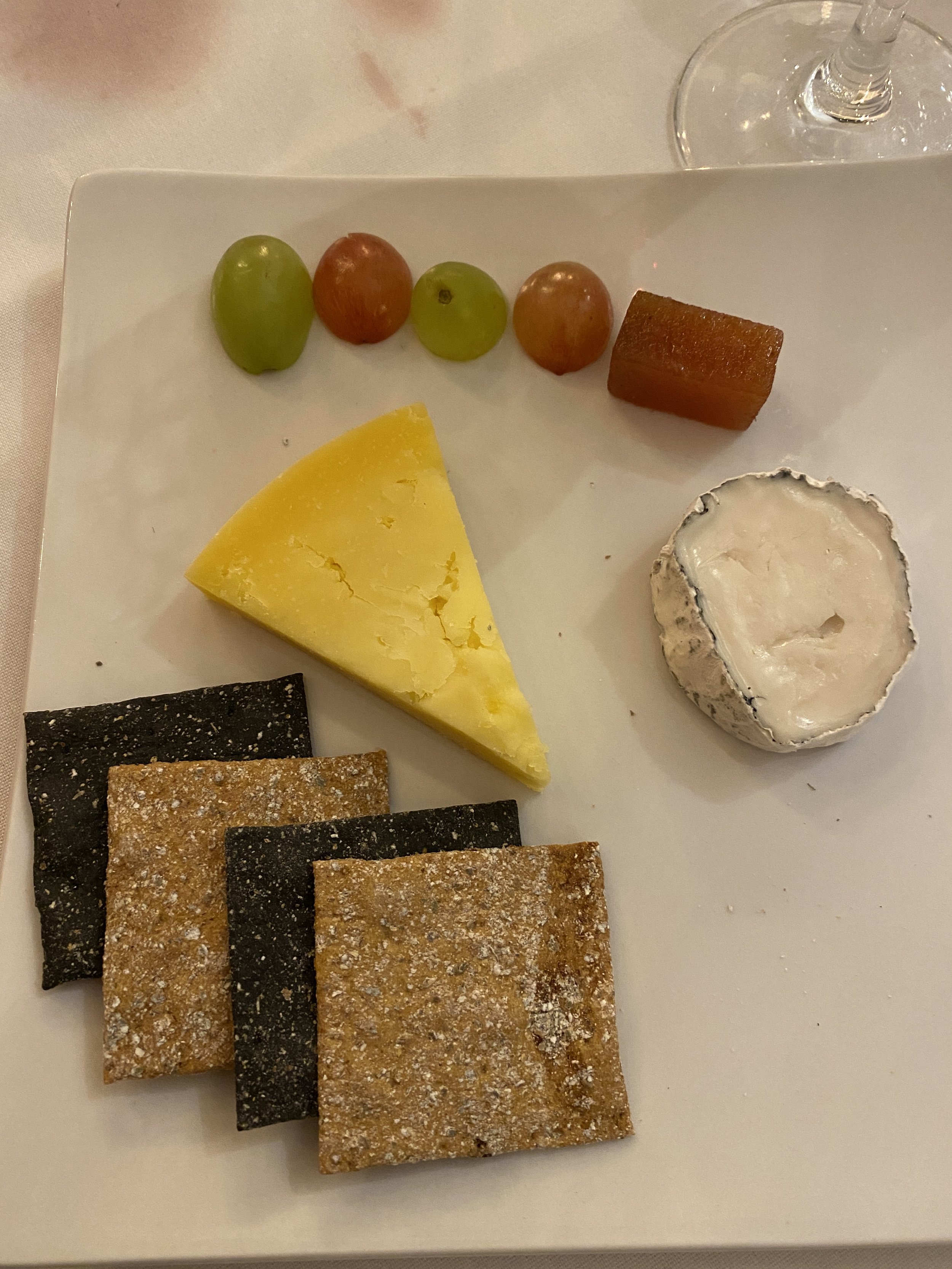 The cheese course was a Cumberland Farmhouse cheddar and a Kidderton Ash soft goat’s cheese served with grapes and quince jelly. The red wine was a Ch. La Lagune 5iéme Cru, A.O.C Haut-Medoc (Cabernet Sauvignon 60%, Merlot 25%, Petit Verdot 15%). A deeply purple wine: No smoke on the water but rather blueberries, cassis, oak all bound with sweet tannin giving a long, long finish. Super!