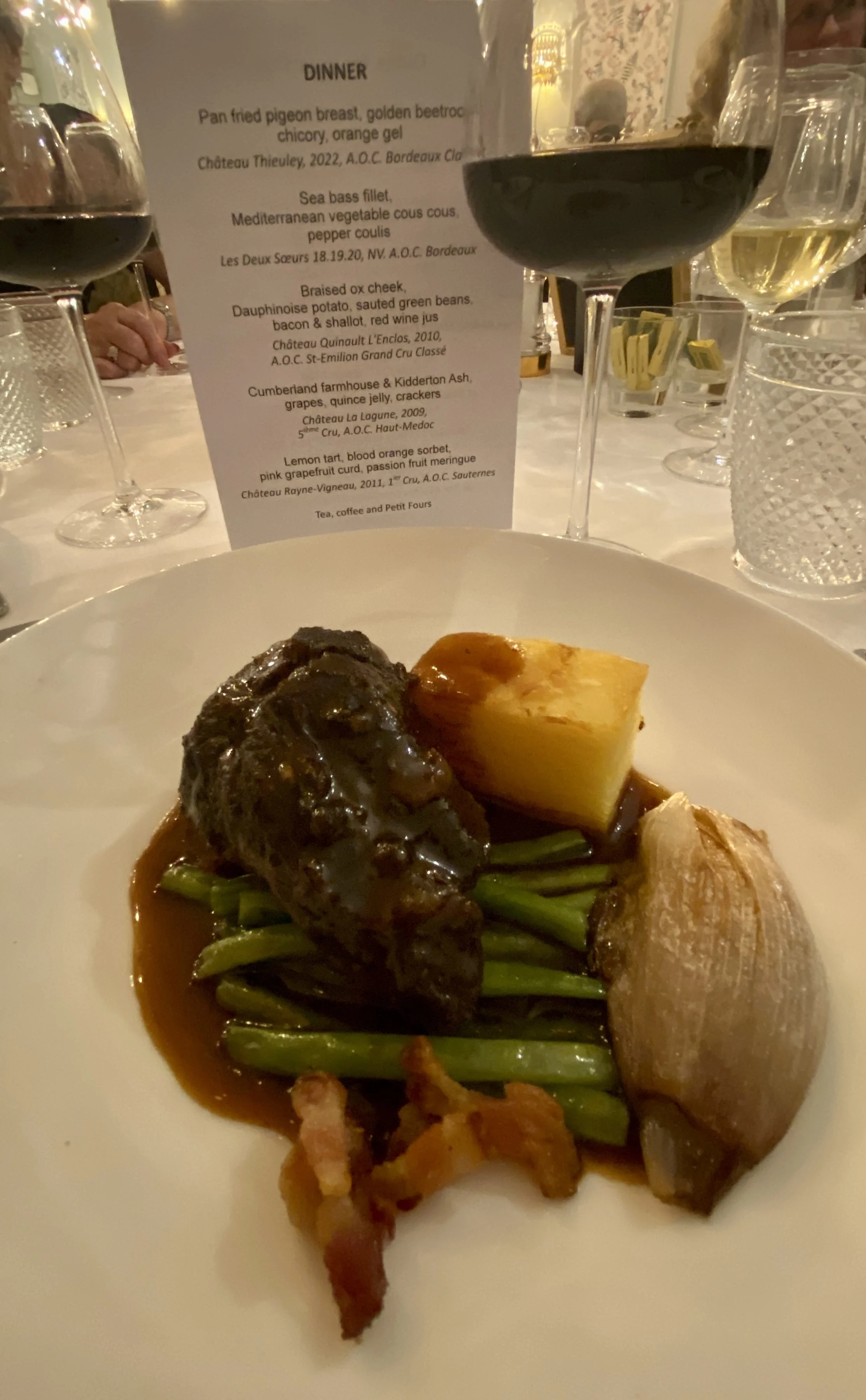 Dessert was a classic “STP” (Sticky Toffee Pudding) and ice cream: Wonderful. Paired with this ‘super-pud’ was a Ch. Raymond-Lafon 2014 A.O.C Sauternes. A blend of 85% Semillon and 15% Sauvignon Blanc gave orange and apricot with subtle honey sweetness: Quite light and not overly concentrated.
