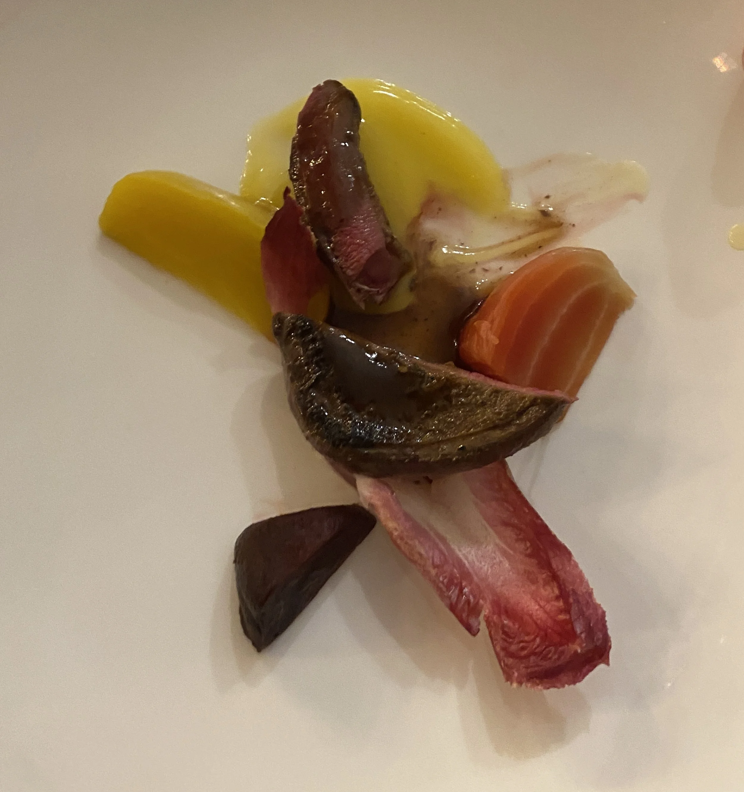 Ch. Thieuley A.O.C Bordeaux Clairet (the historical origin of the word “claret”) 2022 was served with a pan-fried pigeon breast, golden beetroot, chicory and orange gel. This lighter Bordeaux red (70% Merlot, 30% Cabernet Sauvignon) was served chilled and complimented the flavoursome starter course very well. An interesting alternative to the usual/expected white wine and great opportunity to try this style of Bordeaux.