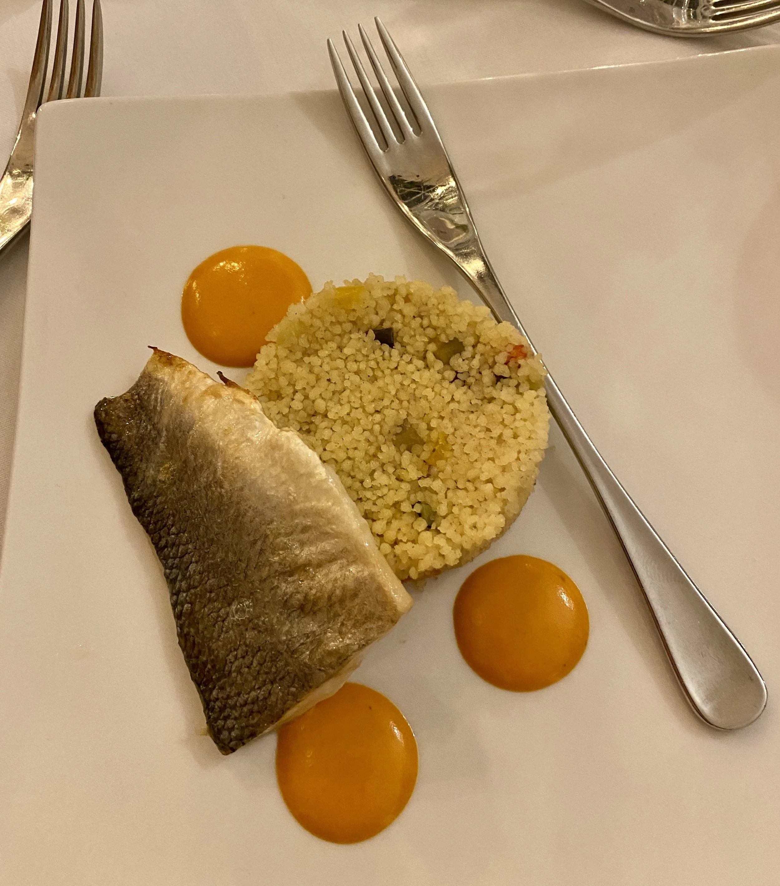The fish course comprised a sea bass fillet, Mediterranean couscous with a pepper coulis. This was served with a Les Deux Soeurs 18.19.20 A.O.C Bordeaux, an interesting blend of three vintages (each having a blend of Sauvignon Blanc, Sauvignon Gris and Semillon). The separate vintages were chosen to bring their own characteristics to the final wine. A good match with this course.