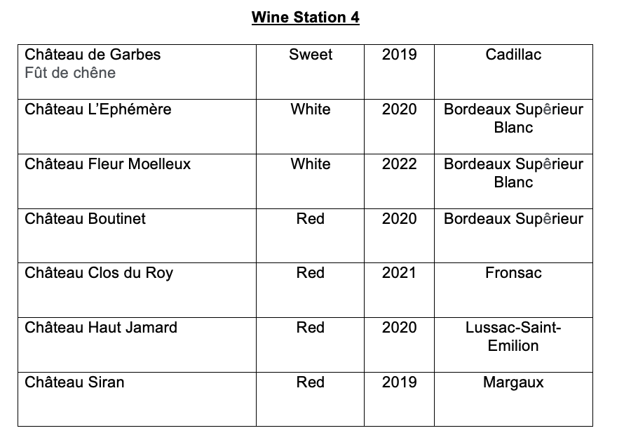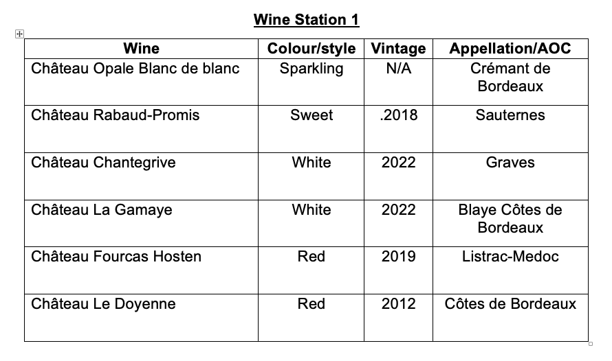 Prior to a four-course lunch with accompanying wines to match those attending were able to sample 2 Crémant de Bordeaux wines, 8 dry white wines, 12 red wines and 3 sweet white wines. The wines shown were from a number of different vintages ranging from 2012 to 2021 for the red wines, 2020 to 2022 for the dry white wines and from 2015 to 2019 for the sweet white wines.