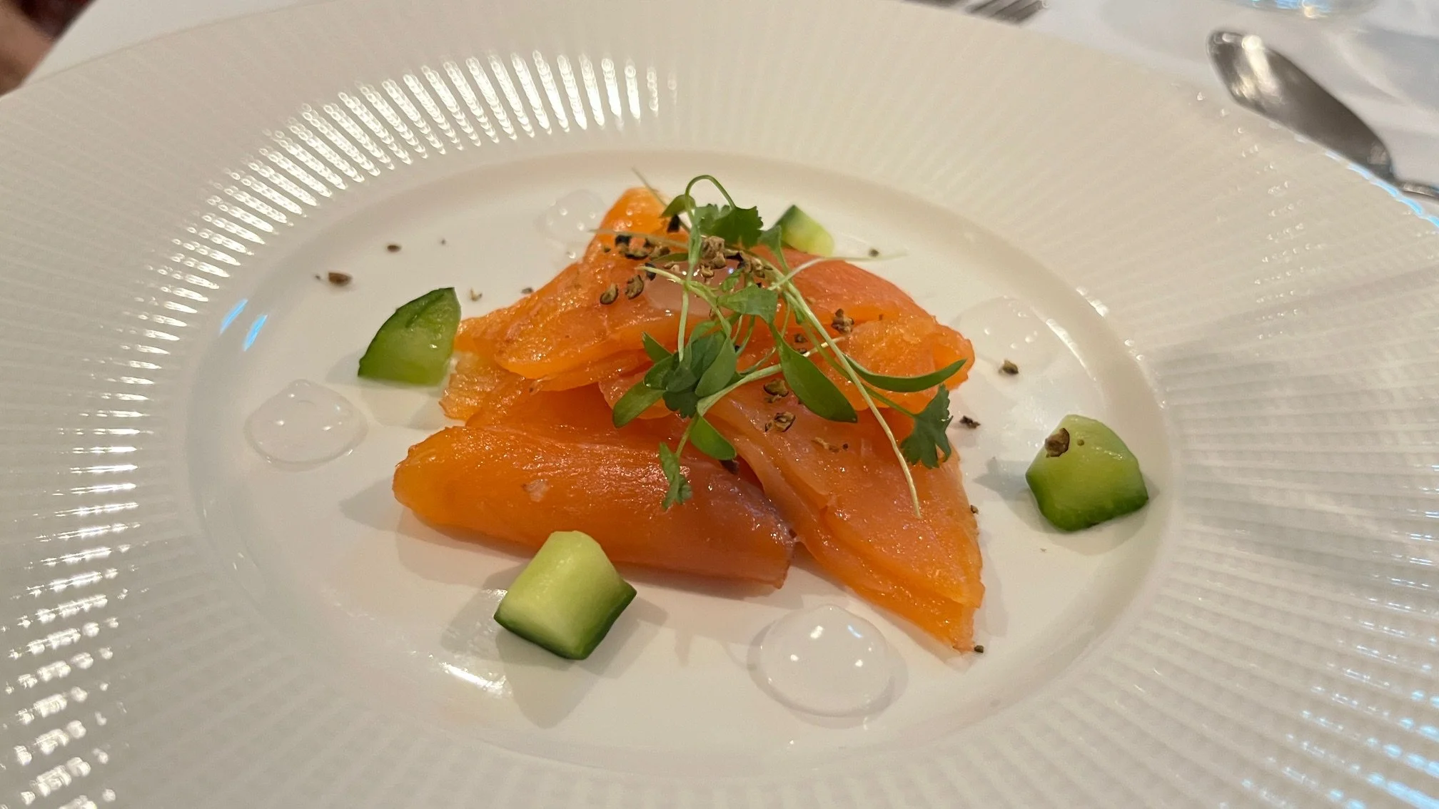 Our Dinner menu was classic and elegant, a testament to the skills of Chefs Alfonso and Giuseppe. We started with Gin and Fennel cured salmon with compressed cucumber and a fantastic tonic jelly, accompanied by G de Château Guiraud 2019, A.O.C. Bordeaux Blanc. This was a fresh and zesty wine with bags of fruit a great match for the robust flavours on the plate.