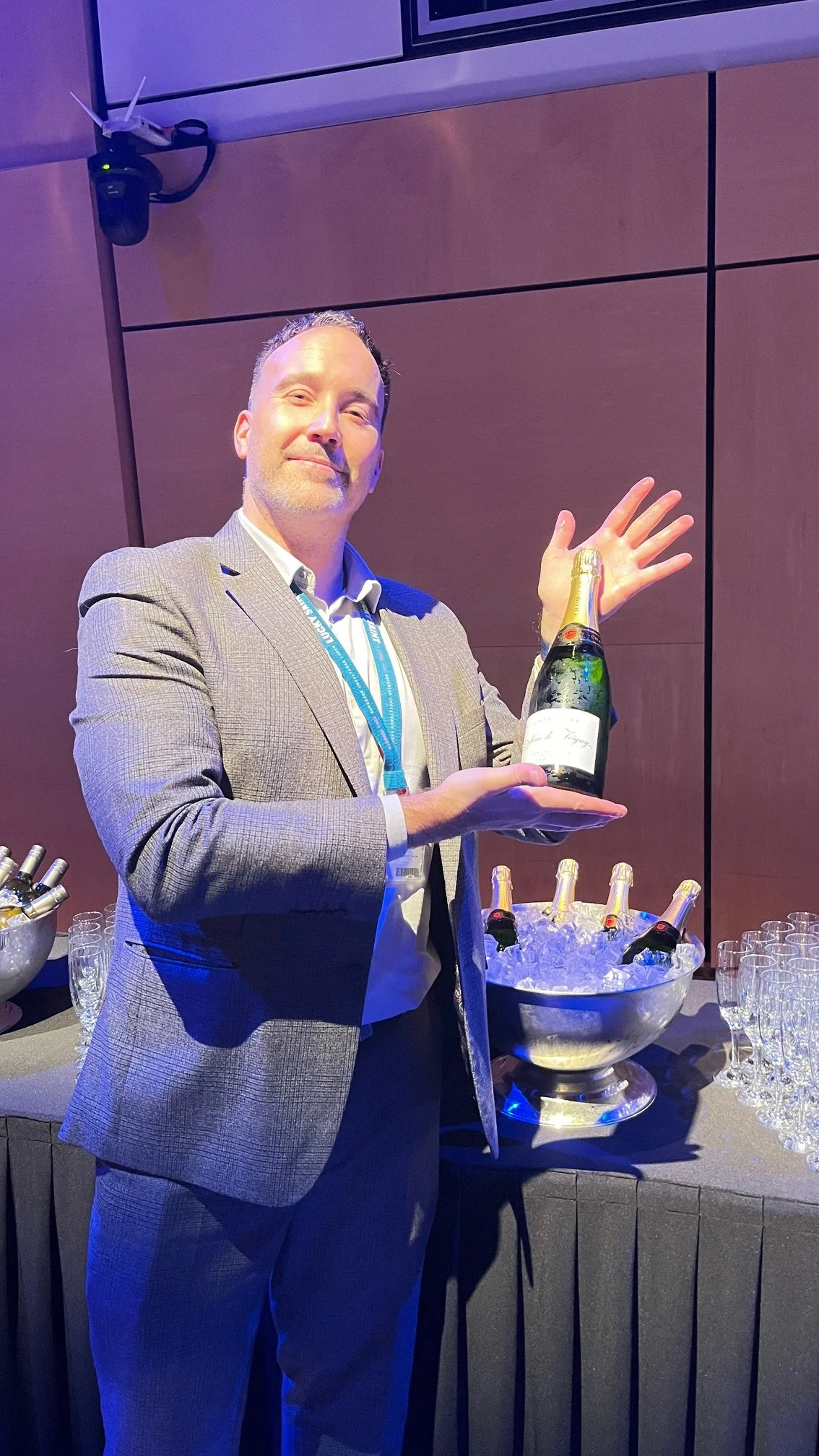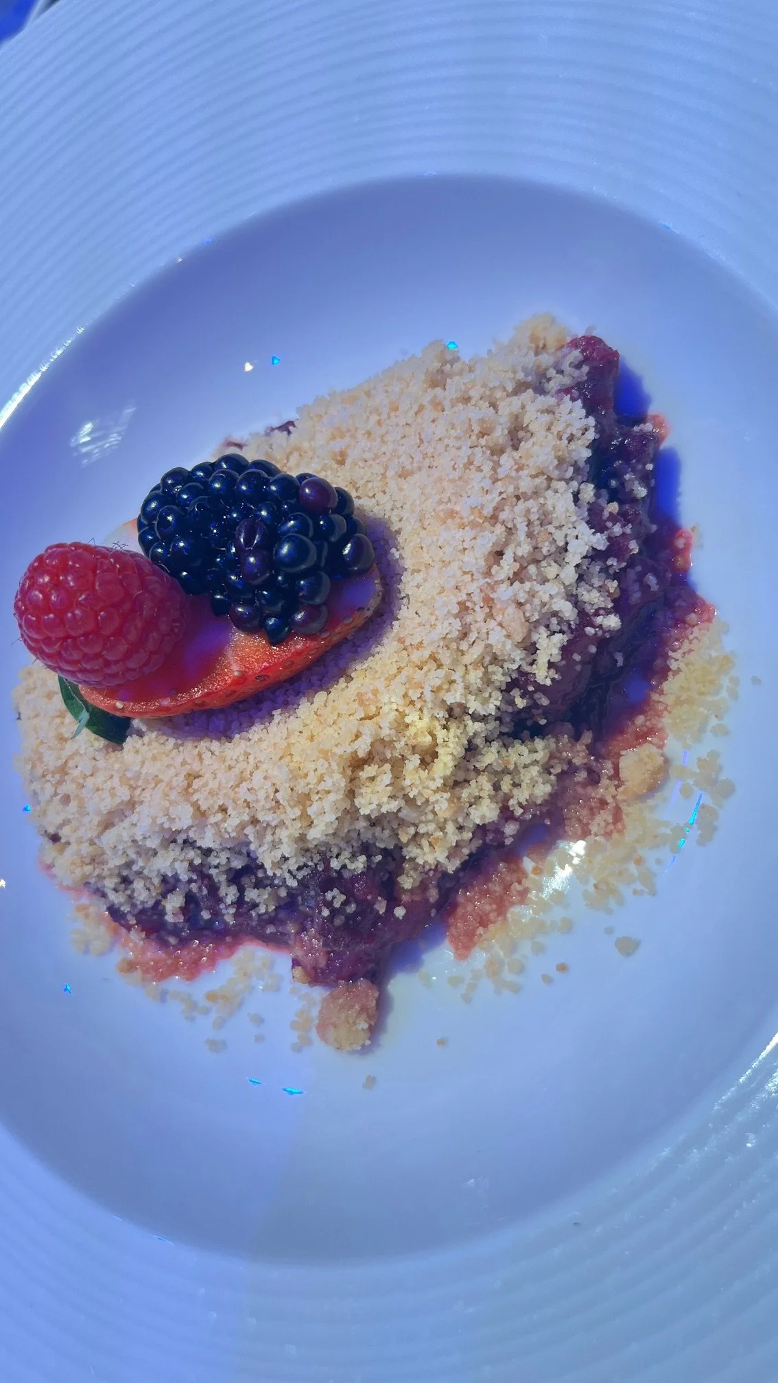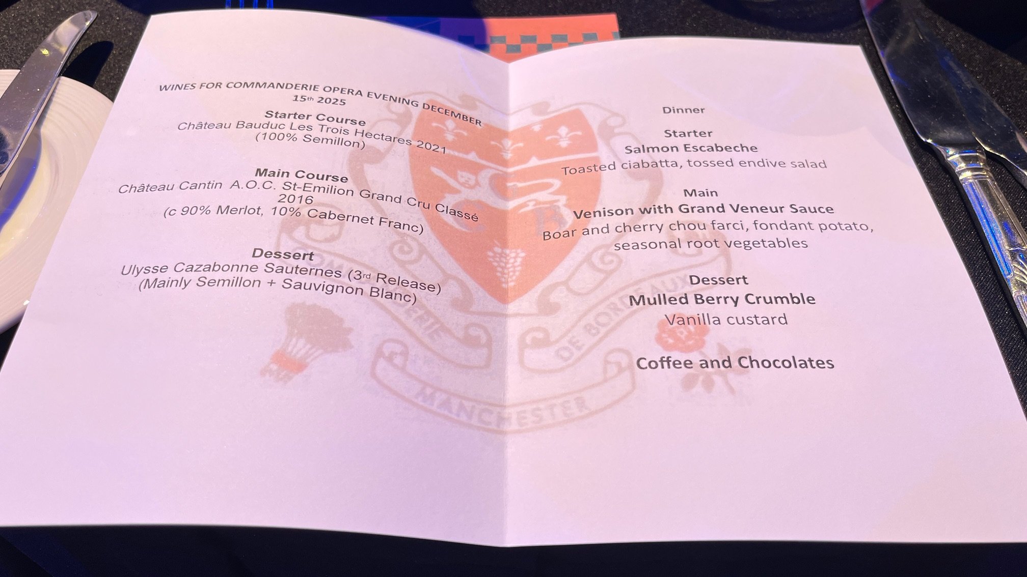 The first half seemed to fly by so we must have been enjoying ourselves, and it was time to return the Carol Nash Suite for our dessert. This was Mulled Berry Crumble with traditional Vanilla Custard. Once again a beautifully executed dish. The accompanying wine was The Wine Society Sauternes 3rd release from Ulysse Cazebonne. This matched perfectly and some commandeurs took their wine into the second half due to the short time.