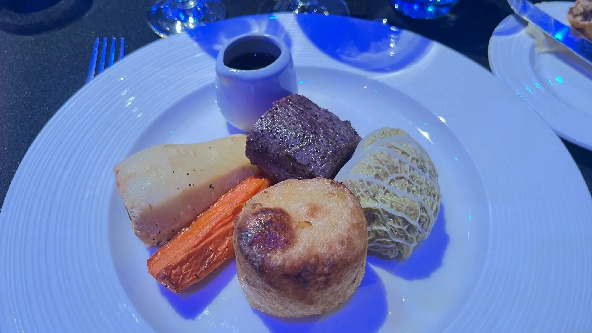 The Main course was Venison with Grand Veneur Sauce, wild boar farci, fondant potato, and seasonal root vegetables. This was again beautifully presented but above all delicious in every respect. The accompanying wine was Chateau Cantin, Grand Cru St Emilion 2016. This wine from an excellent vintage, was fresh with good fruit, acidity and some dry tannins on the finish. The tannins as expected melted away when set against the meat flavours of the dish. A wine which would continue to drink well for many years if we had any more.
