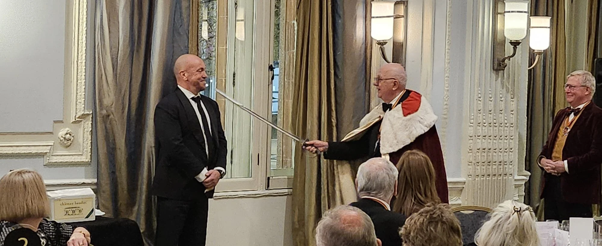 Immediate Past Maître, Peter Russell, was presiding in the absence, on the other side of the world, of Maître Colin Smith. Régent Andy Bacon introduced two new Commandeurs for intronization: they were Lucy Houghton and Dave Golding; and, unusually, neither of them turned out to be a lawyer. They were welcomed warmly but had to take a certain risk. A lack of foresight meant the theatrical, blunt, short sword in the keeping of Maître Smith was unavailable and RégentBacon procured an alternative weapon, lethal in appearance. The ceremonies went off without injury but we began to imagine how future Maîtres might choose to exercise their authority. Would they prefer a sabre or a scimitar, the imprecise power of a two-handed sword or the precise attack of an épée?