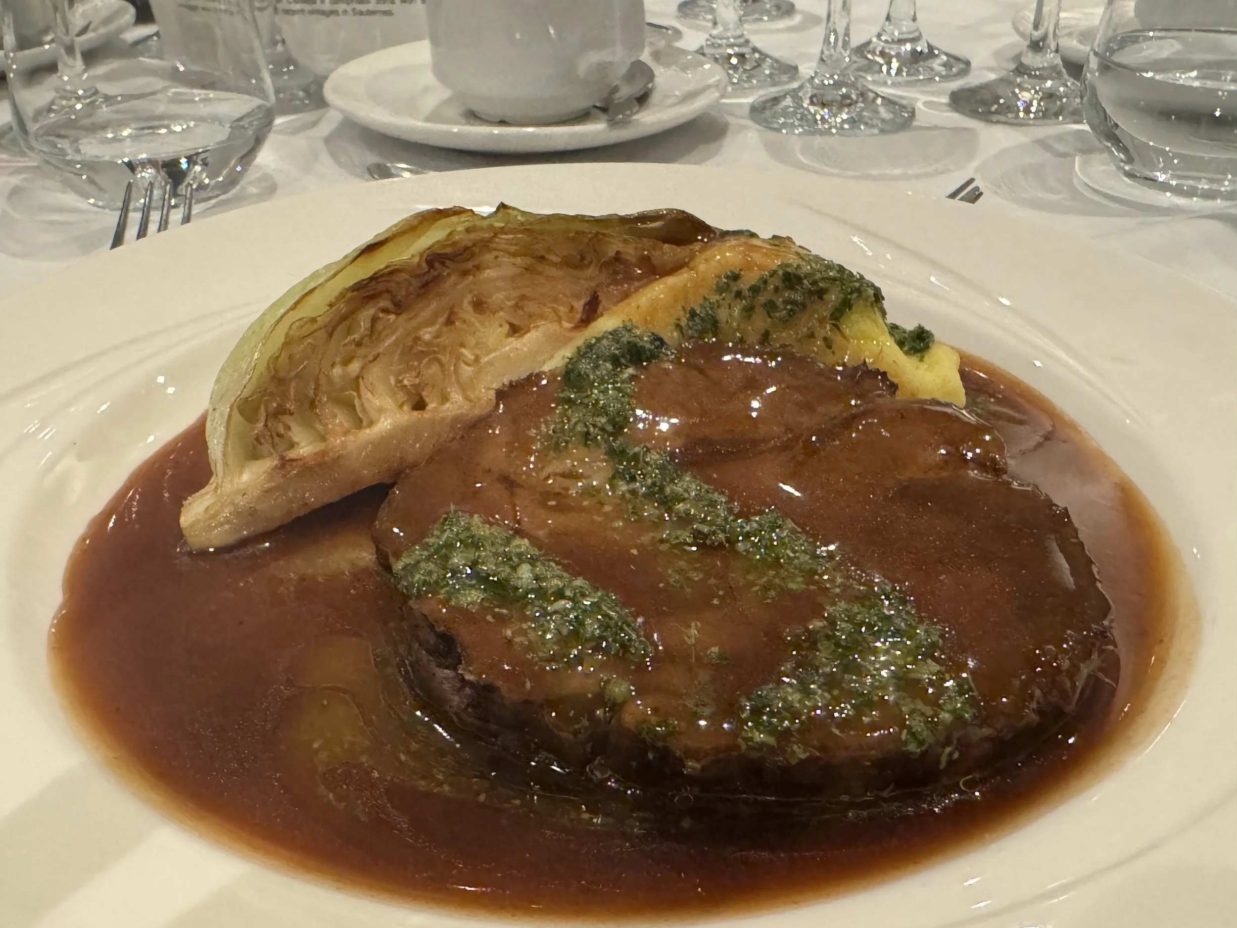 With the starter of chicken terrine, we enjoyed the Carillon d’Angelus 2018. This is a separate Cuvée, not a ‘second wine,’ and is made by the same team as Angelus. The Carillon has its own vines and its own identity. The blend is 85% Merlot and 15% Cabernet Franc and it delivered to us dusty fruit and dark tannins at the front which gave way to a long finish.