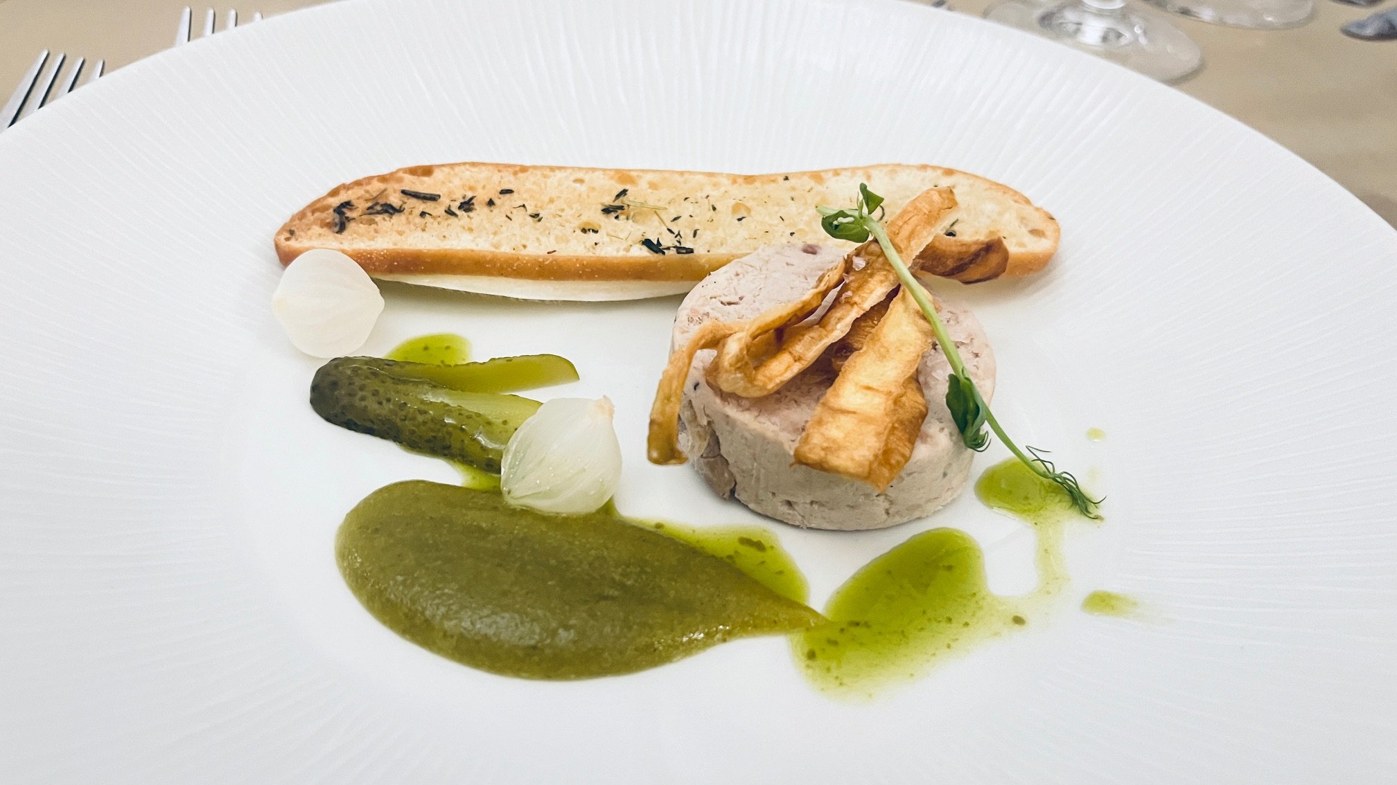 We dived into the starter with some enthusiasm. This was Rillettes of Pork with cornichon ketchup and silver skinned onion. We drank a WS Generation Graves Blanc from 2021. Régent Rowley explained that while the year was difficult for reds, the whites came out well. Semillon is the majority grape and provided the fullness to a satisfying wine. Some bottles had an unmistakable aroma of the Sauvignon Blanc in the blend (about a third), others did not. The palate was full and long. Both presentations were lovely and stood up well to the strongly flavoured accompaniments of the dish.