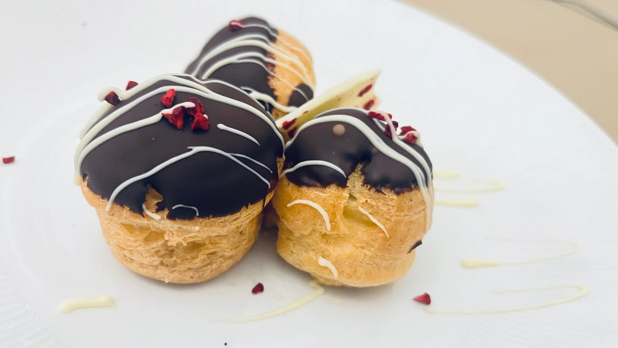 Decadence was the order of the day for dessert – white chocolate, pistachio and raspberry profiteroles ! These were paired with Château Suduiraut 2010 1er Cru A.O.C. Sauternes. Cmdr. Edwards noted that this wine was greatly enjoyed by all and if not definitely the best wine of the night was certainly one of the best two. Members noted hazelnuts, honey and marmalade on the palate and one person mentioned that the nose was reminiscent of an old cognac.